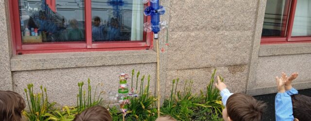 Seguimos relacionando estas actividades con el proyecto del viento. En esta ocasión quisimos hacer, ya que estamos en primavera y el tiempo comienza a mejorar, un espantapájaros o molino de viento, para colocar en el jardín-huerta que tenemos en el patio. Primero pedimos la colaboración de las familias pidiendo que trajesen de casa botellas de plástico tipo zumo, bebidas con gas o de agua