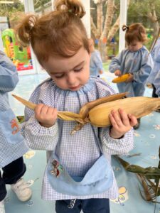 DESARROLLO: Previamente a la realización de esta actividad trabajamos con los niños y niñas los elementos del otoño, haciendo hincapié sobre todo en el maíz y su cultivo. Una vez supimos los conocimientos previos del alumnado y hablamos un poco sobre este cultivo, pasamos a realizar la actividad.