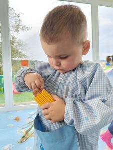 MATERIAL: Maíz, cubo de actividades Montessori, tarjeta reciclada, papel de colores, tubos de tarjeta reciclados, ‘peneira’, cesto y caja de tarjeta reciclada.