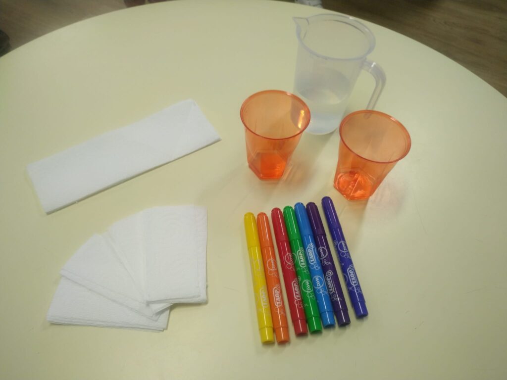 Vamos a necesitar el siguiente material: 2 vasos transparentes con agua hasta la mitad, rotuladores de colores (del arcoiris), tiras de papel absorvente de cocina cortadas en tamaño 6×20.