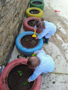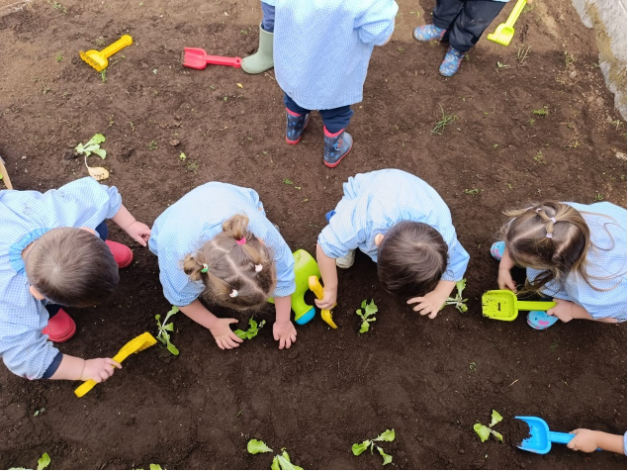 Con la ayuda de las profes, los niños y niñas fueron plantando todas las plantas que habíamos comprado el día anterior, y una vez plantadas les echamos un poco de agua con la ayuda de unas regaderas para que crecieran fuertes.