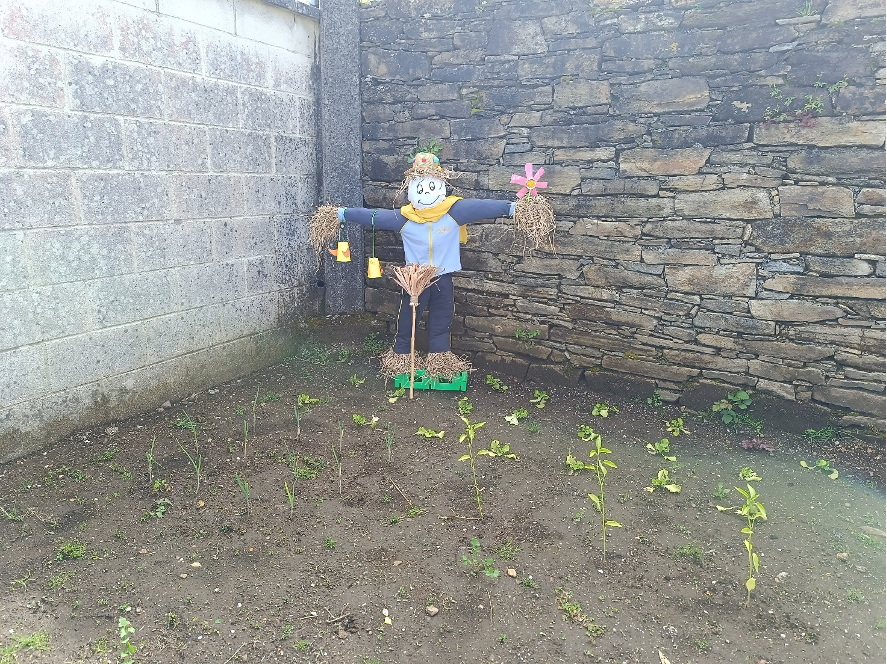 Cuando finalizamos de plantar y regar, le dimos el toque final a nuestro huerto colocando en él a nuestro amigo el espantapájaros para mantener alejados a los pájaros de nuestros cultivos.