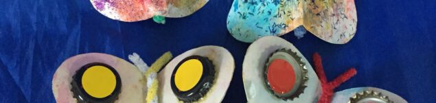 En la EIM A Guarda (Pontevedra) han realizado estas divertidas mariposas. A continuación, te contamos cómo: Materiales: Cartón (en este caso de los cartones que llevan los paquetes de yogures), papel pinocho de colores, chapas de las botellas, silicona líquida, limpiapipas de colores, purpurina y cola. 1. Recortamos los cartones con forma de alas de mariposa 2. Mojamos trocitos de papel pinocho en un