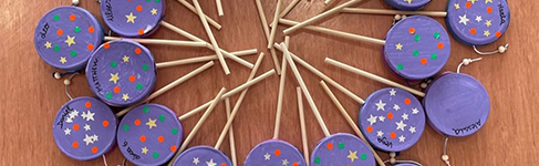 Para realizar esta actividad en el Centro de Conciliación Los Alcázares (Murcia) la escuela pidió a los padres y madres que enviaran una caja de quesitos vacía para realizar un instrumento musical. Material: cajas de quesitos, pintura, gomets, lana, palo de madera y bolas de madera. Desarrollo: Cuando ya tenían todas las cajas de quesitos, las pintaron de color lila. Cuando se secaron, les pusieron